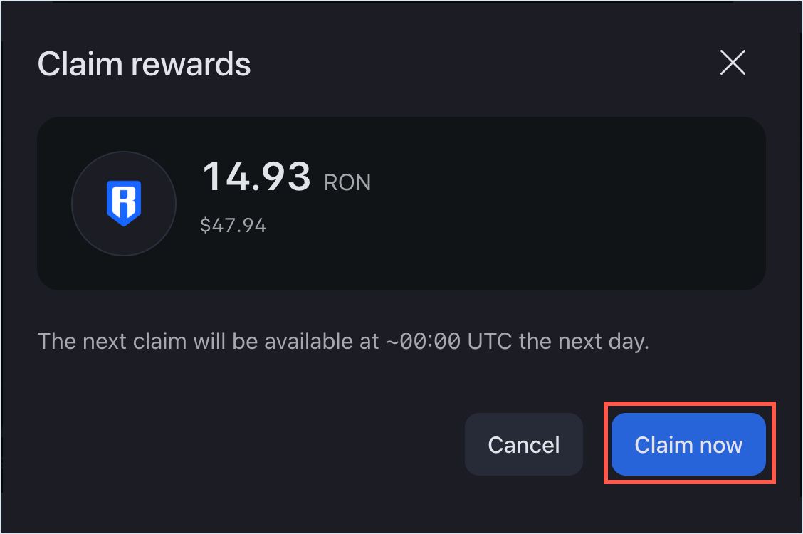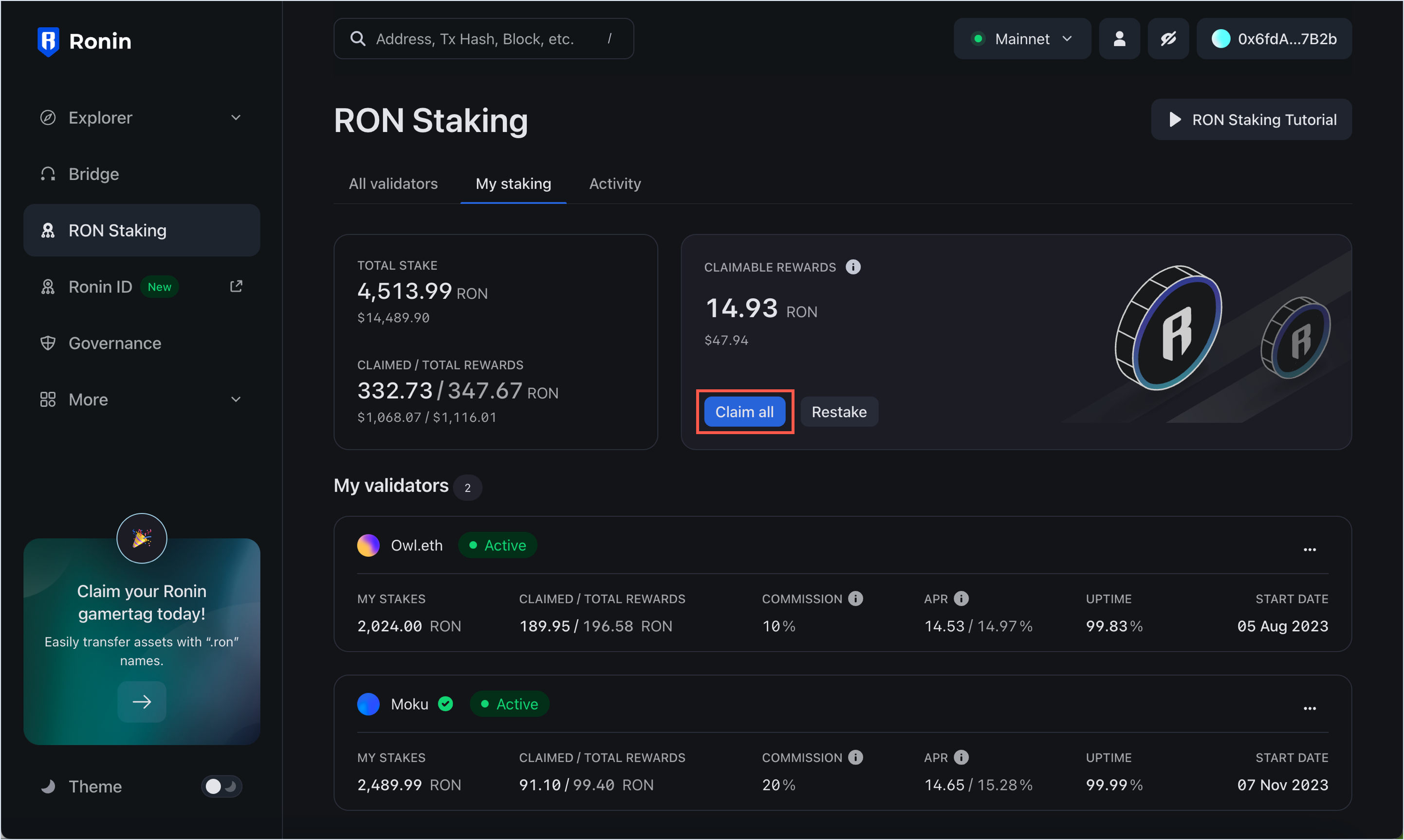 This page describes how to claim your RON staking rewards or restake them to your favorite validator.