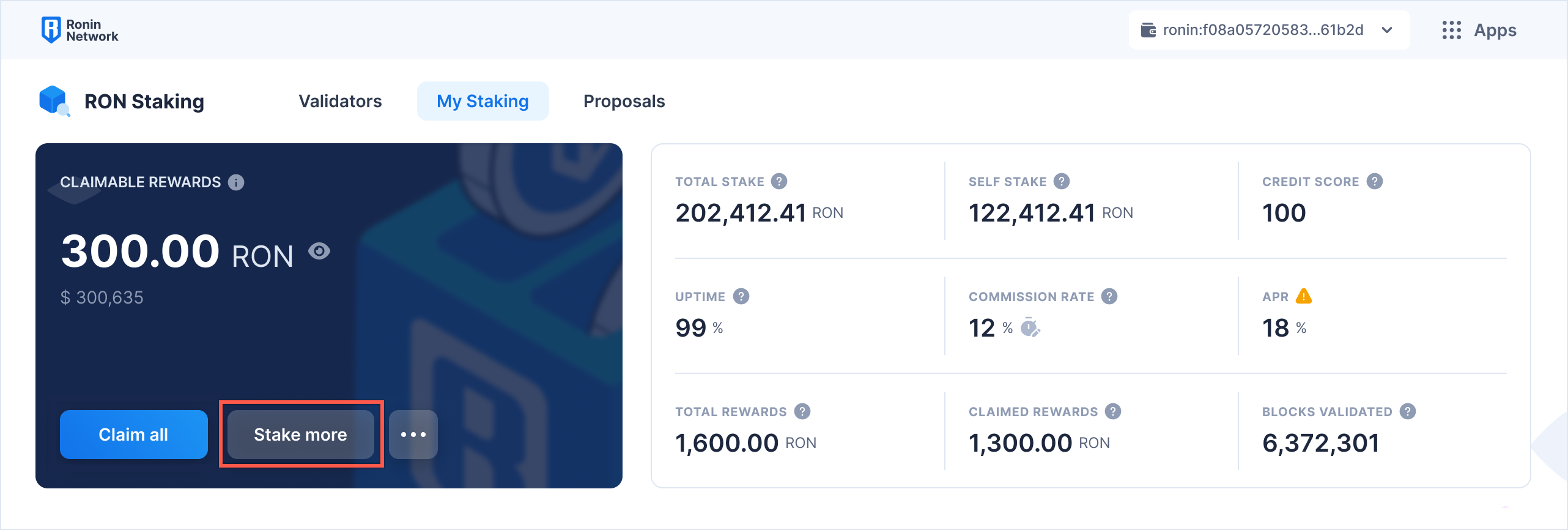 Open the Validator Dashboard, then select My Staking, and then click Stake more.